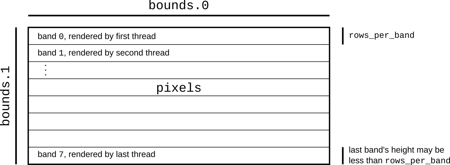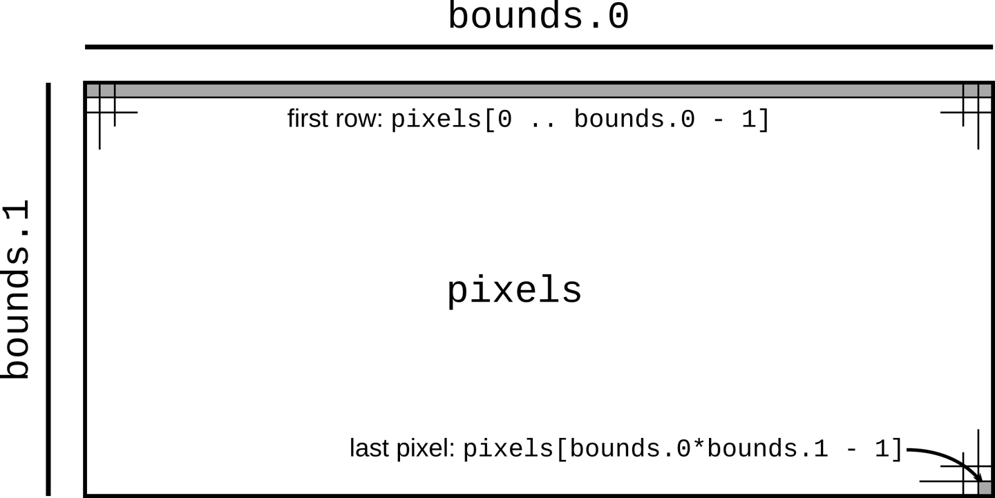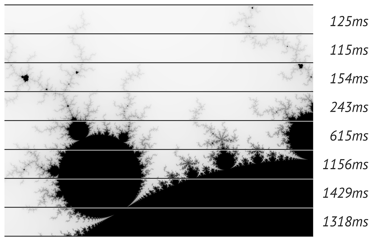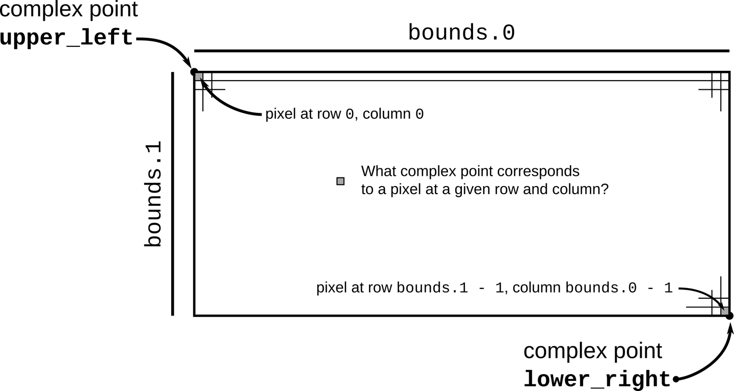 Our third program plots a beautiful fractal, distributing the computation across multiple threads for speed. This includes an example of a generic function, illustrates how to handle something like a buffer of pixels, and shows off Rust’s support for concurrency.